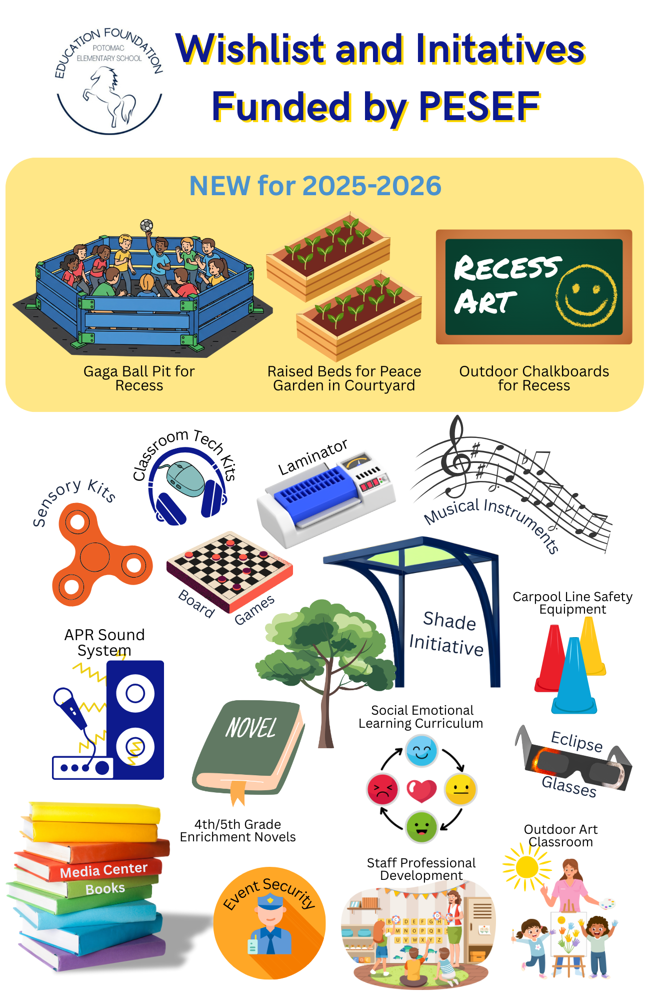 The PES Education Foundation works in partnership with the PTA and our school’s administration to identify important capital improvements and establish programs that have a multi-year impact.